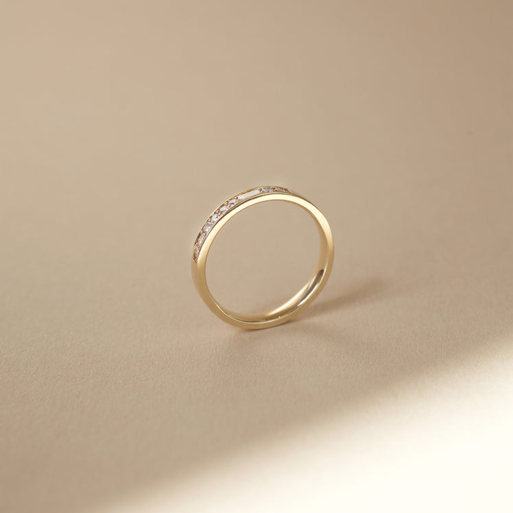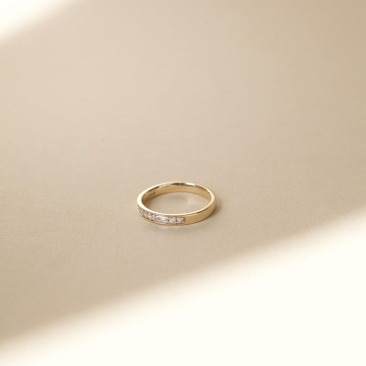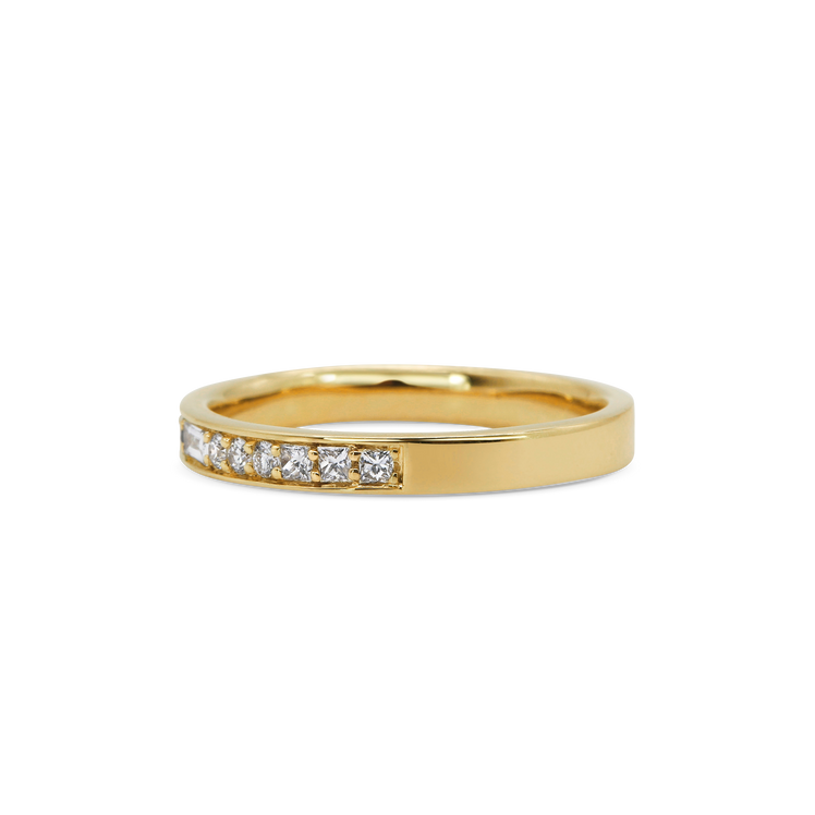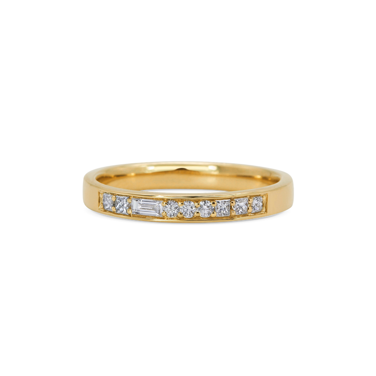 Art Deco inspired diamond wedding band featuring asymmetric diamond cuts