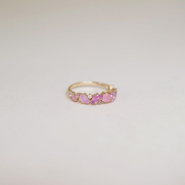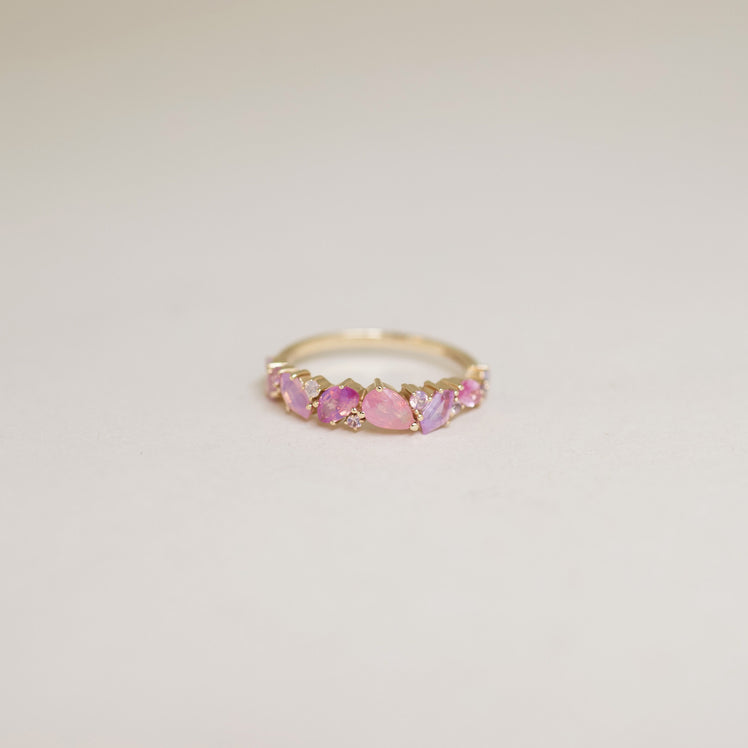 A geometric cluster of mixed shape and custom cut opalescent sapphires originating from Vietnam. This ring is one of a kind due to the unique nature of the rare individual stones used.
