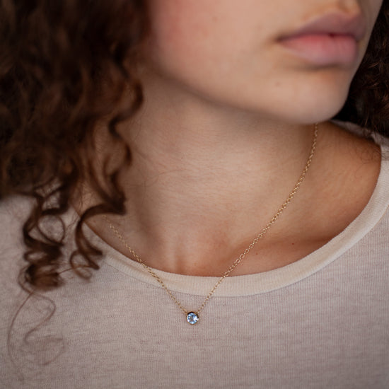 Featuring a sparkling sky blue aquamarine, this stone is securely held in a bezel setting.