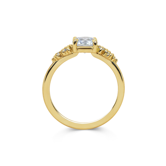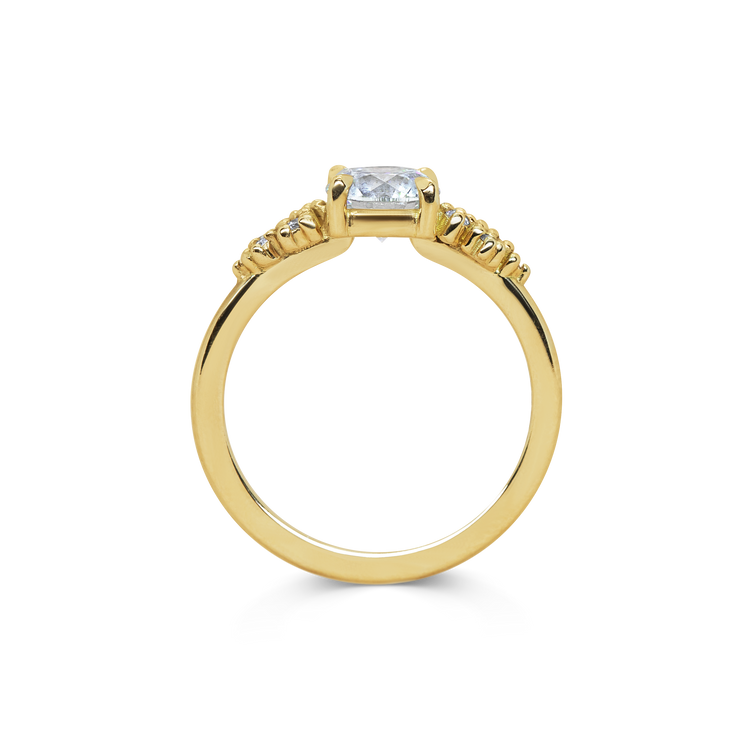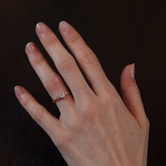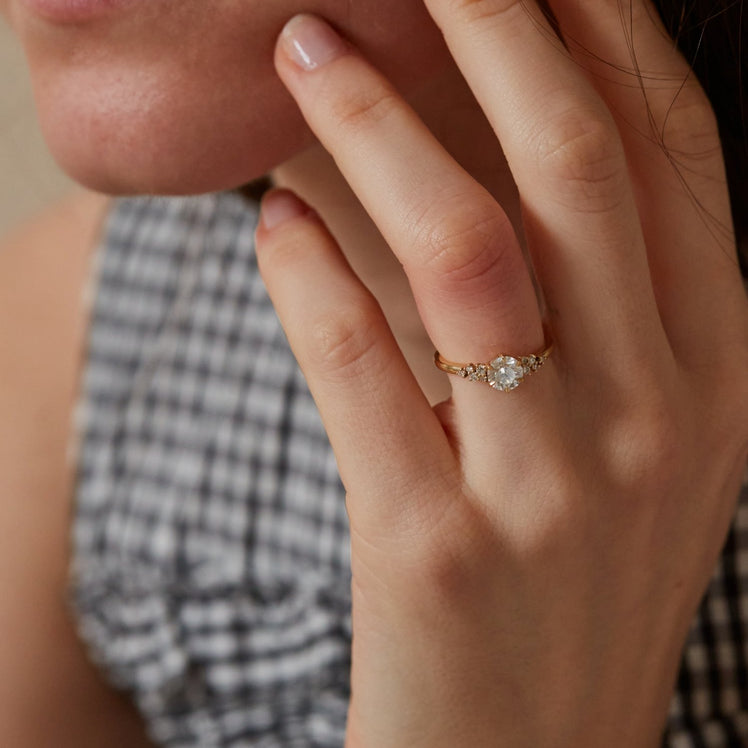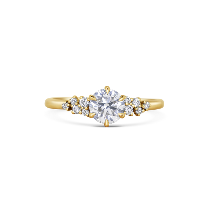 For the one who wants a quirky out-of-the-ordinary asymmetric design that still feels timeless and balanced. Delicate constellation clusters of tiny white diamonds add organic detailing to this beautifully dainty ring.