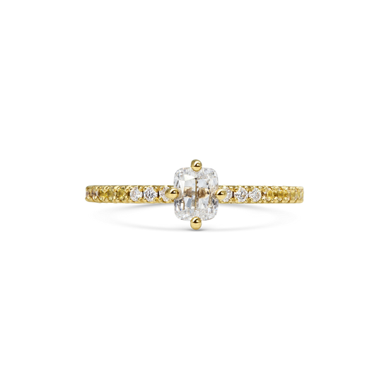 Cushion cut centre diamond, set compass style on a glittering band of yellow sapphires and white diamonds