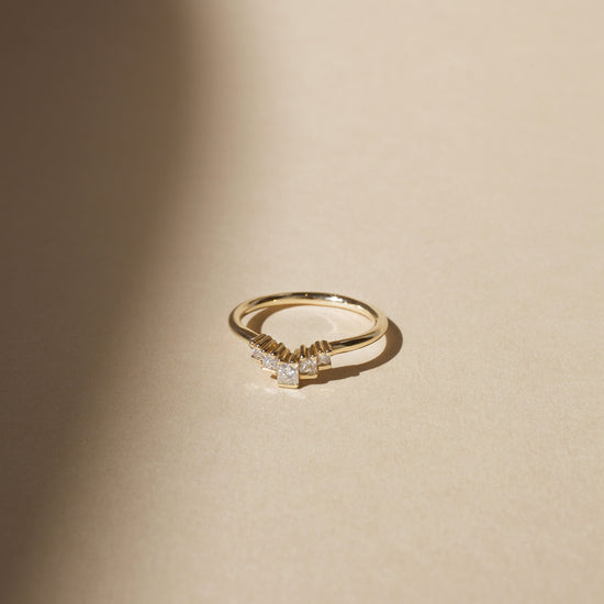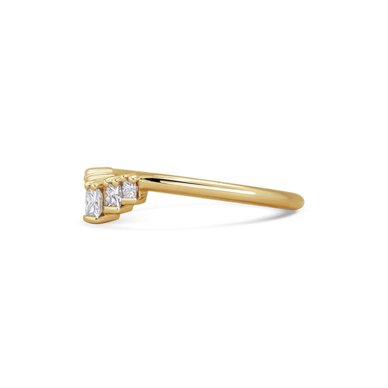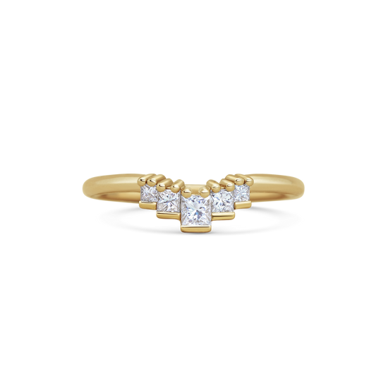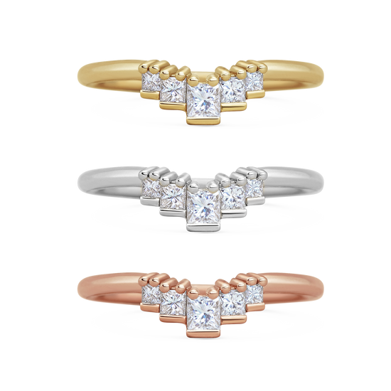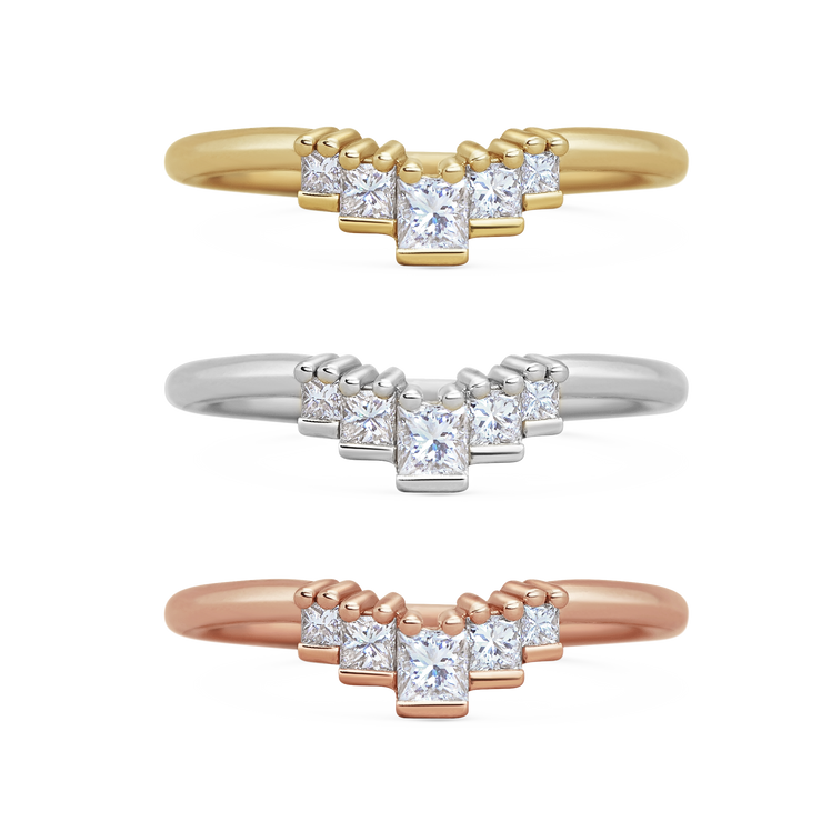 The curves on our crown rings are designed to frame and accentuate your engagement ring. This one fits best next to a solitaire style ring with a round stone up to 5mm in diameter.