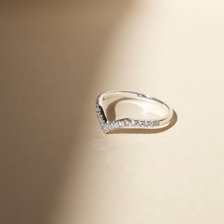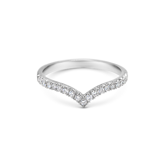 Features a V shaped design. Ideal for stacking with engagement rings that don’t stack well next to straight wedding bands.