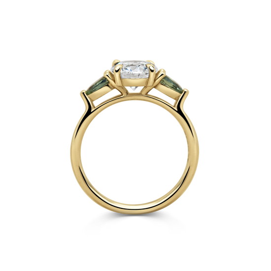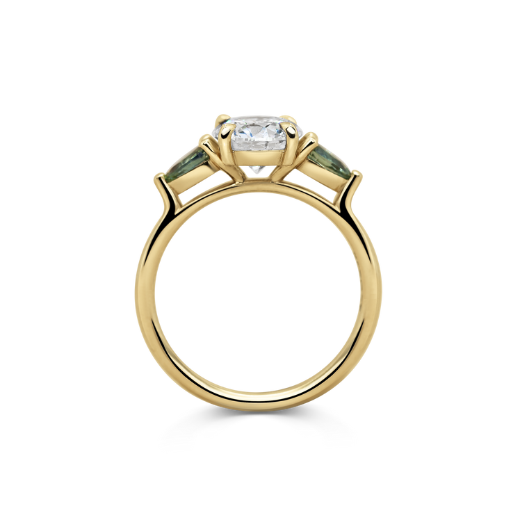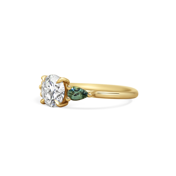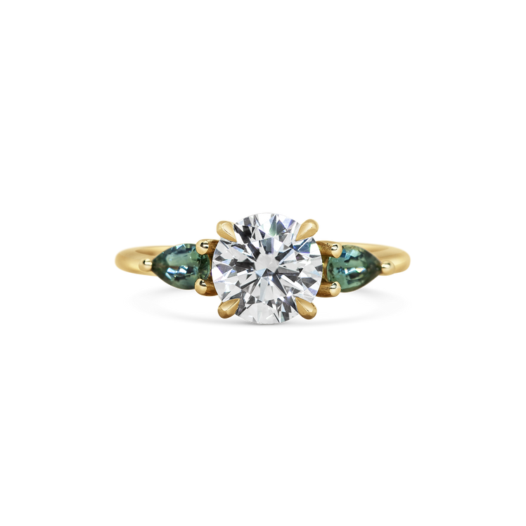 The classic trilogy ring gets a colourful update in this white diamond and teal sapphire combination