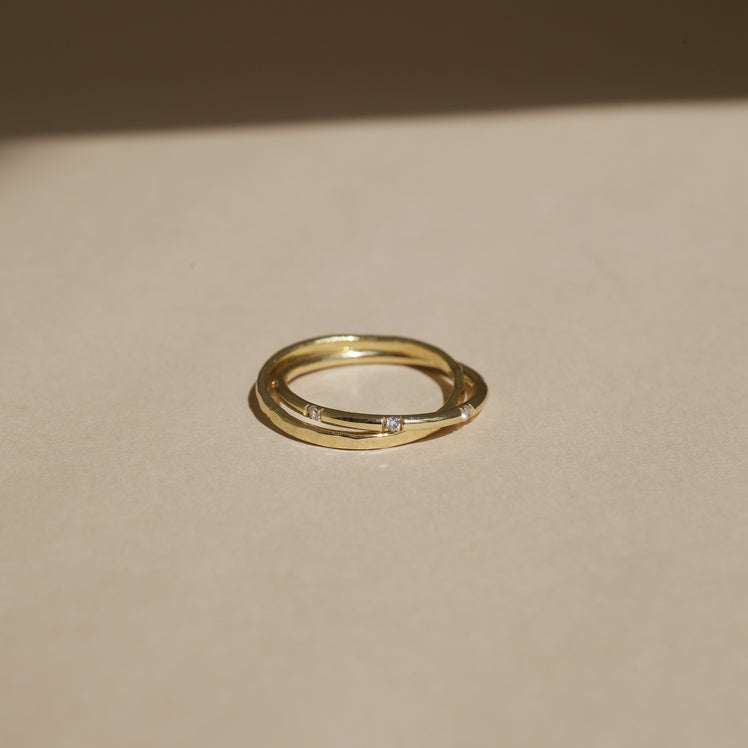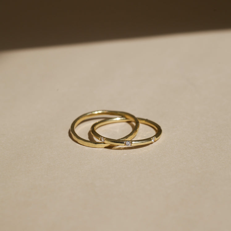 A modern scattered eternity ring with diamonds evenly spaced along the band, Paired with a delicate hammered band. This style is great if you have a more organic ring to create a more fluid stack.