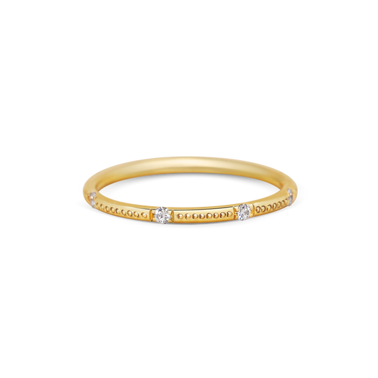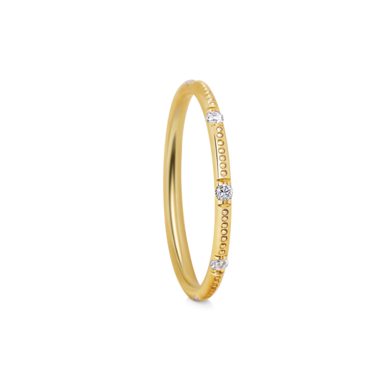 A delicate but detailed band featuring 8 sparkling diamonds set amongst a tiny dotted engraving pattern.