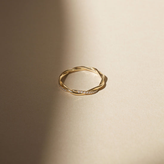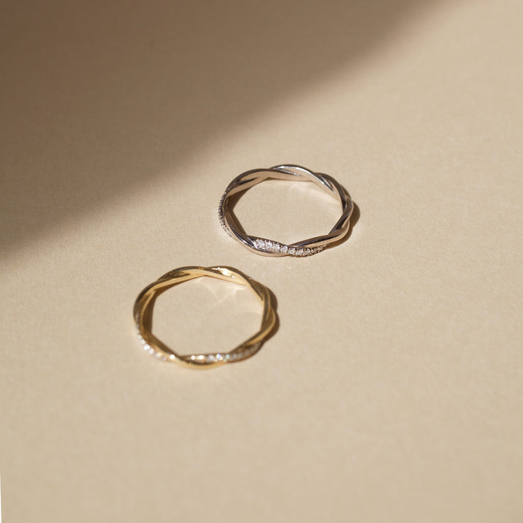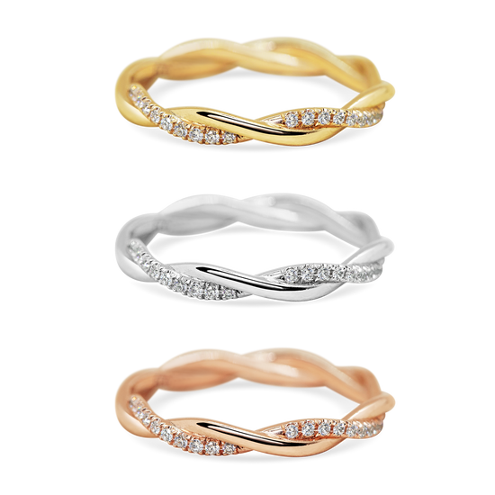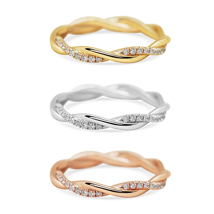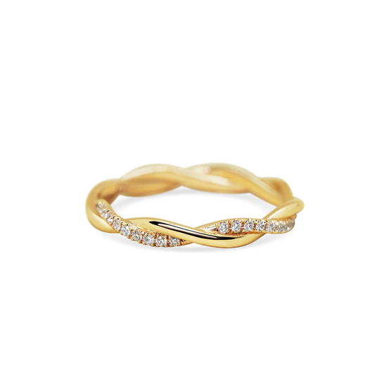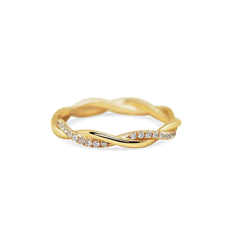 On this delicately twisted band, one strand is meticulously paved with sparkling tiny diamonds across the top half of the ring. A romantic update to the classic wedding band.