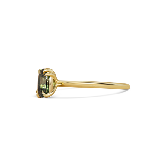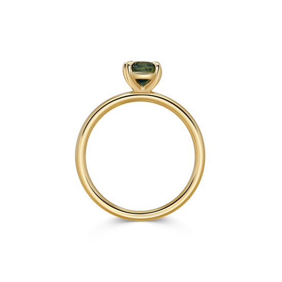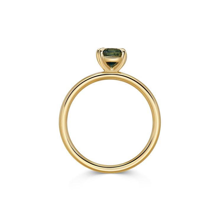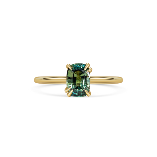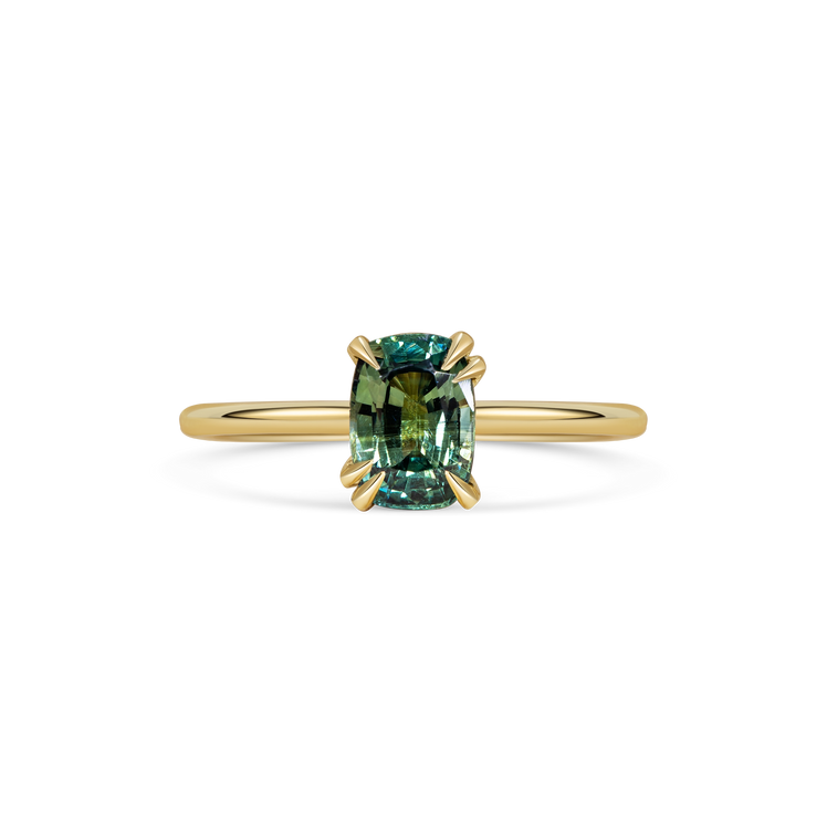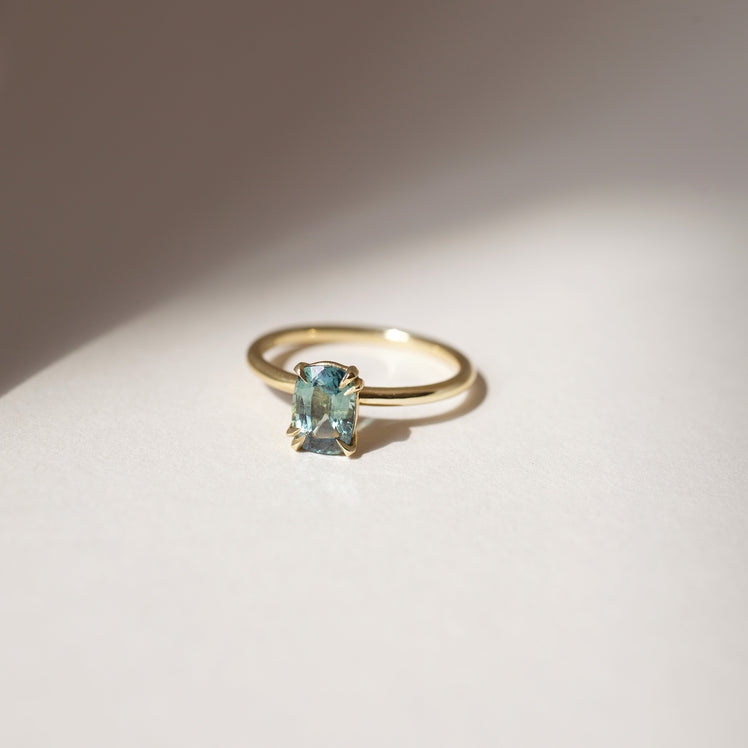 A classic solitaire with an artistic twist. Featuring asymmetric details and a colourful elongated cushion sapphire.