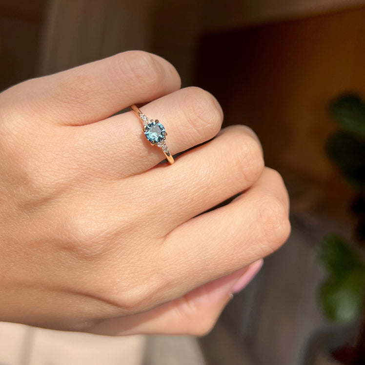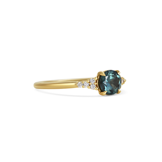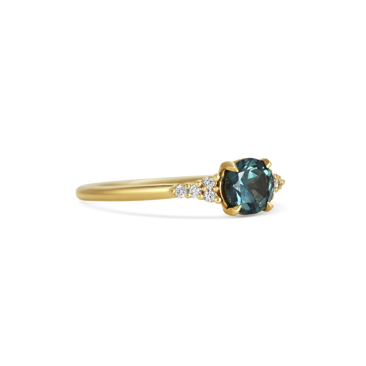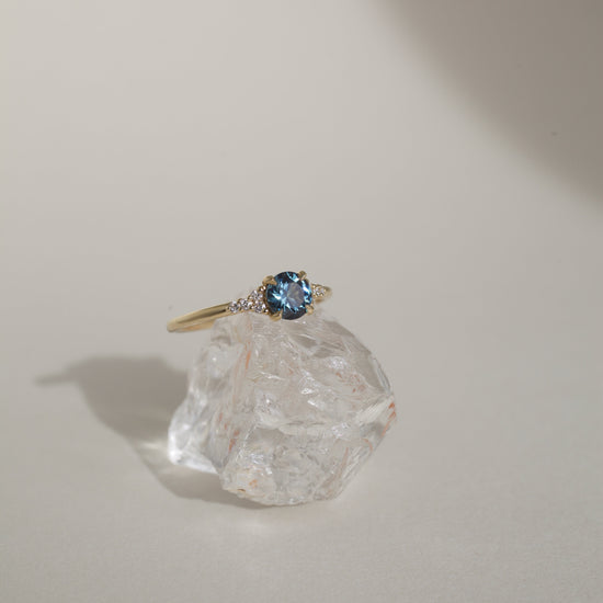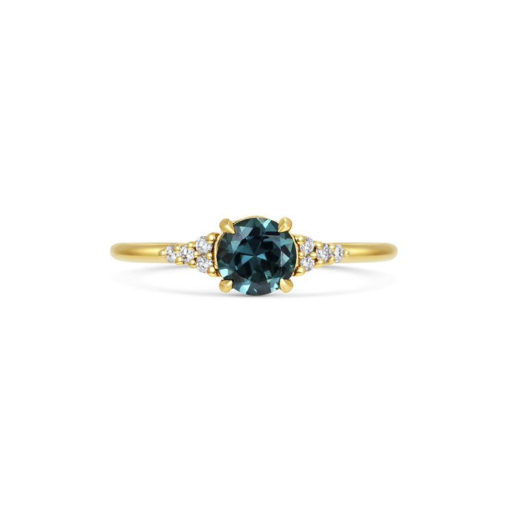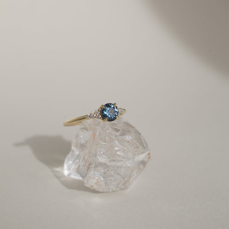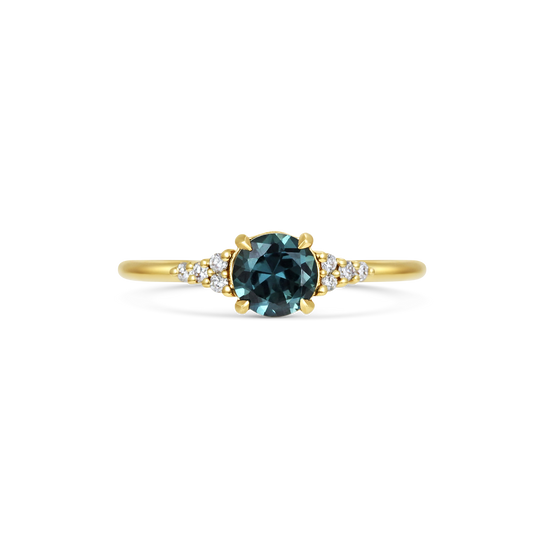 A vintage inspired beauty with a modern twist, Hollie holds a round sapphire centre flanked by sprinkles of white diamonds.