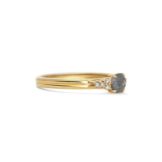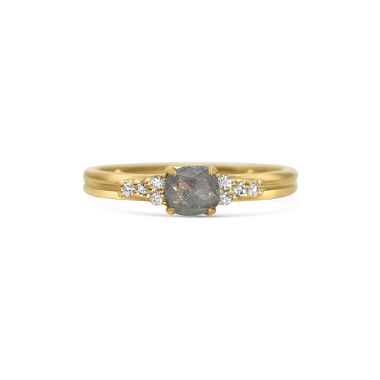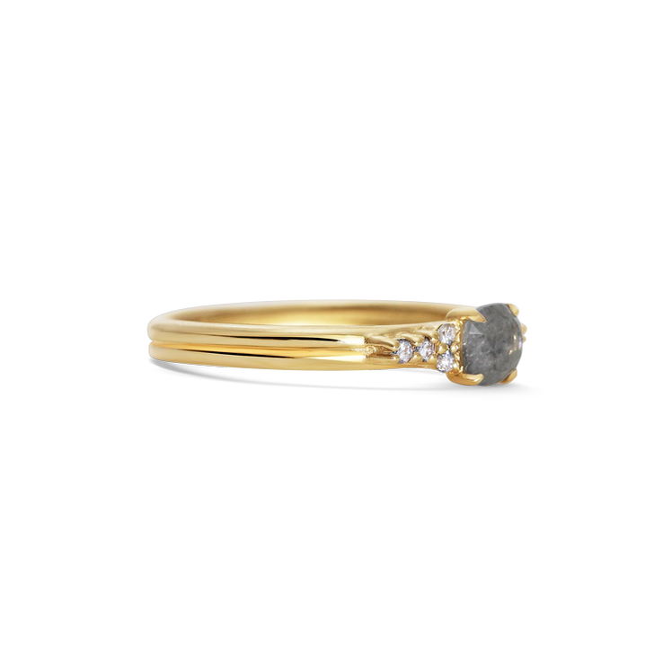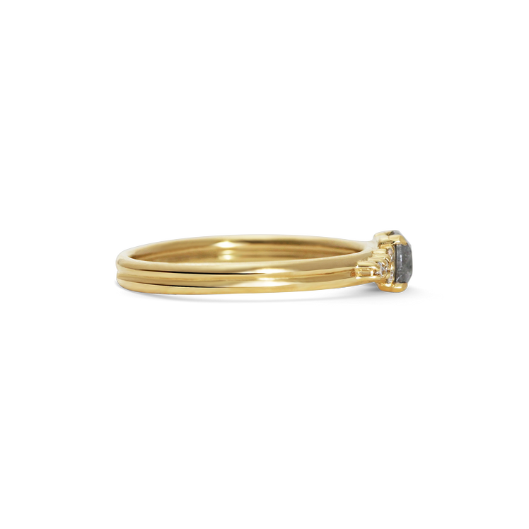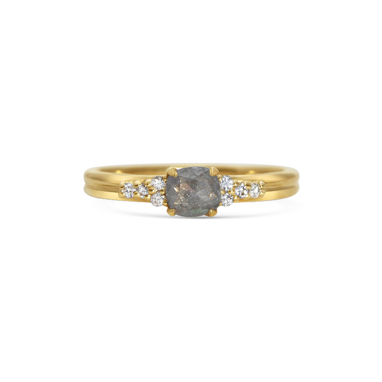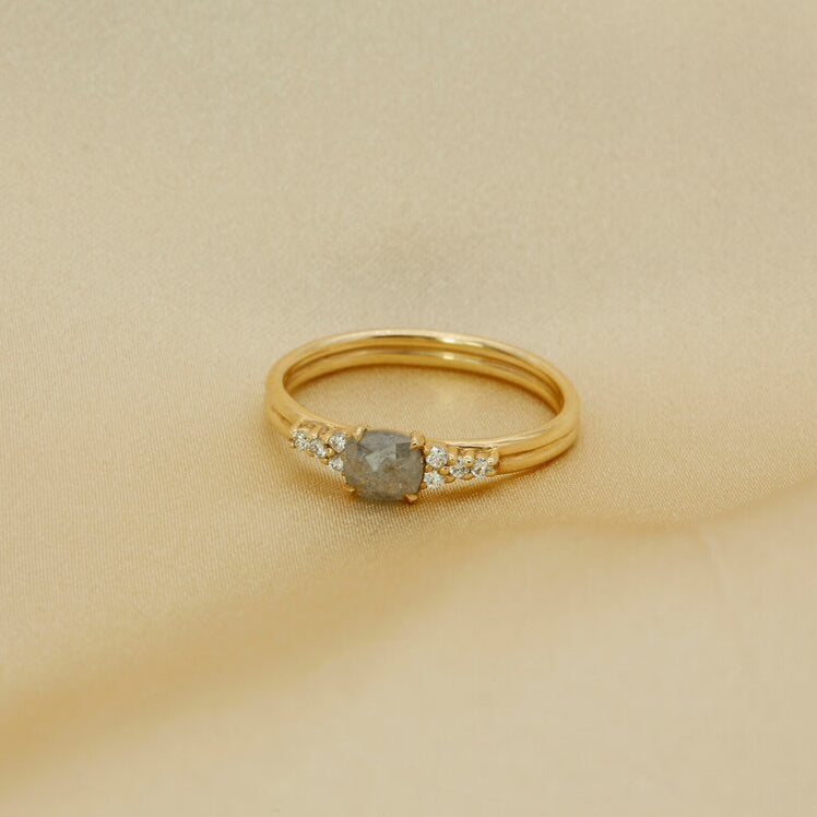 Petite clusters of small white diamonds surround an imperfect grey rose cut diamond centre on a double band design.