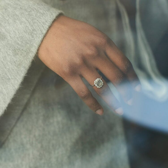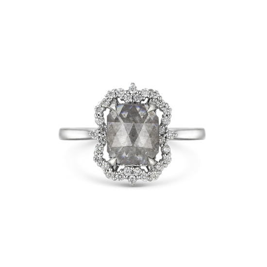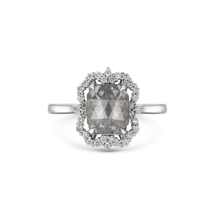 Vintage inspired portrait-style diamond halo surrounds a salt & pepper rose cut grey diamond in this one of a kind white gold ring
