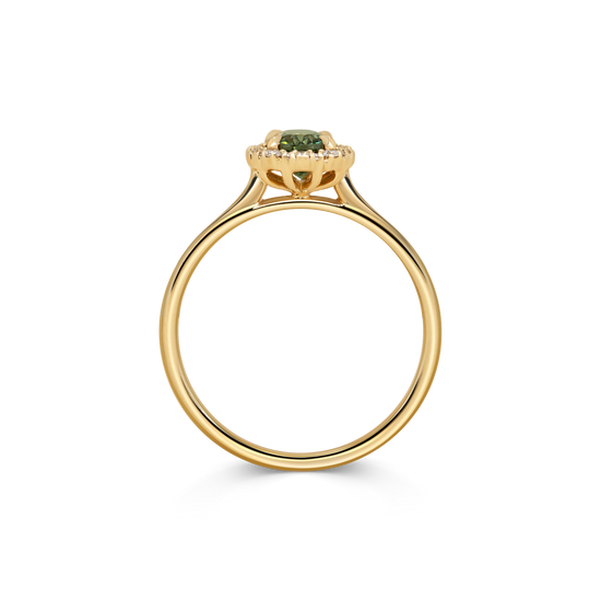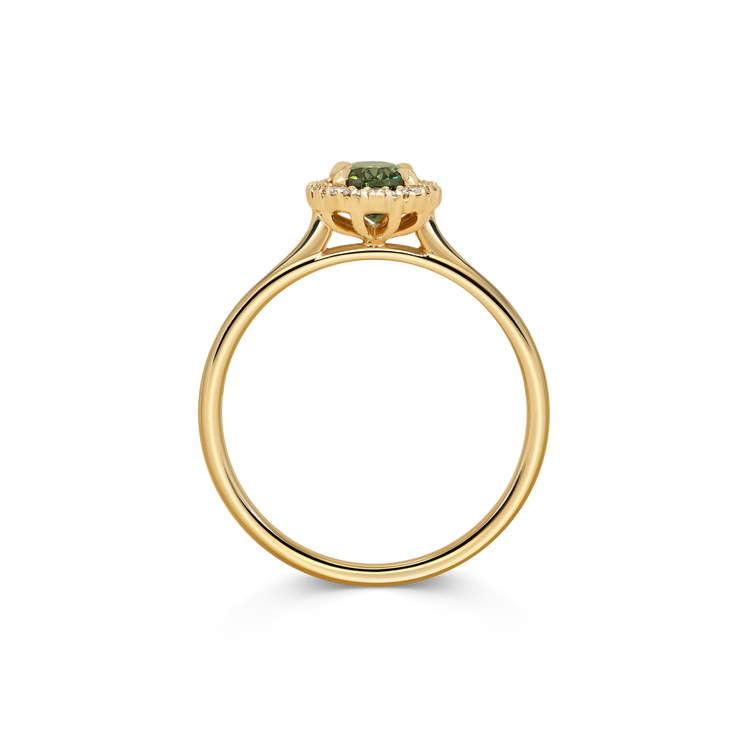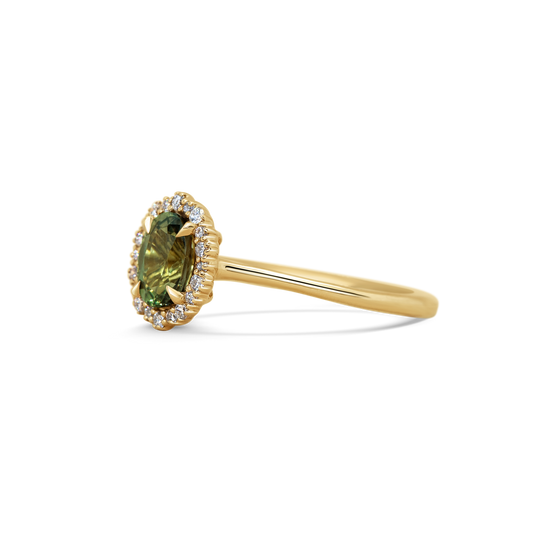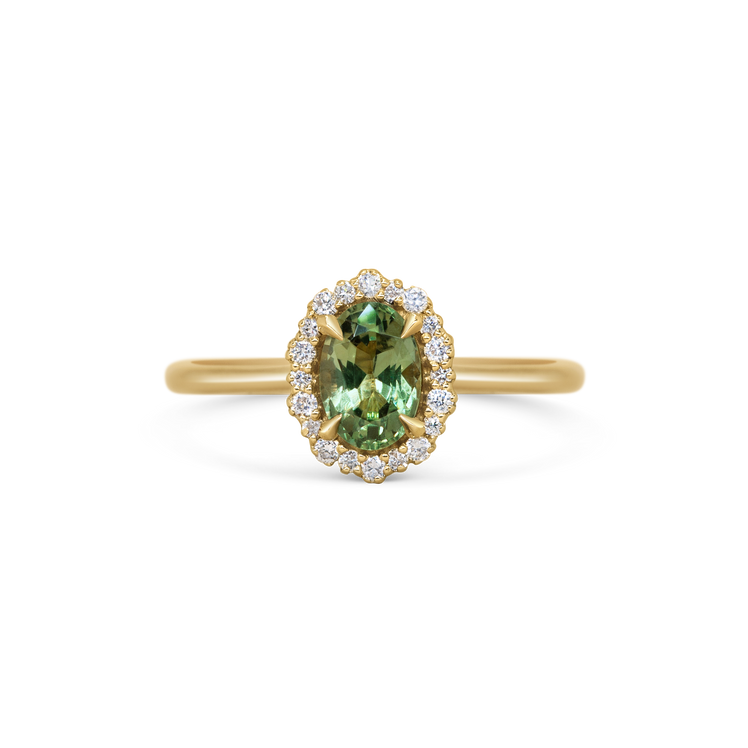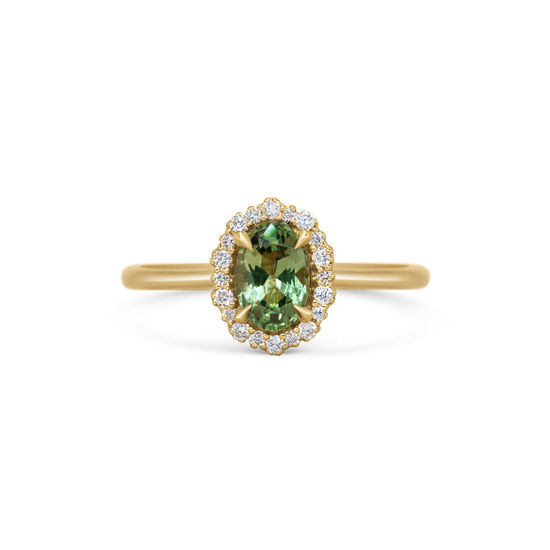 The daintiest, almost lace-like halo of white diamonds surround an oval green sapphire in this unique interpretation of a classic design.