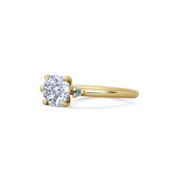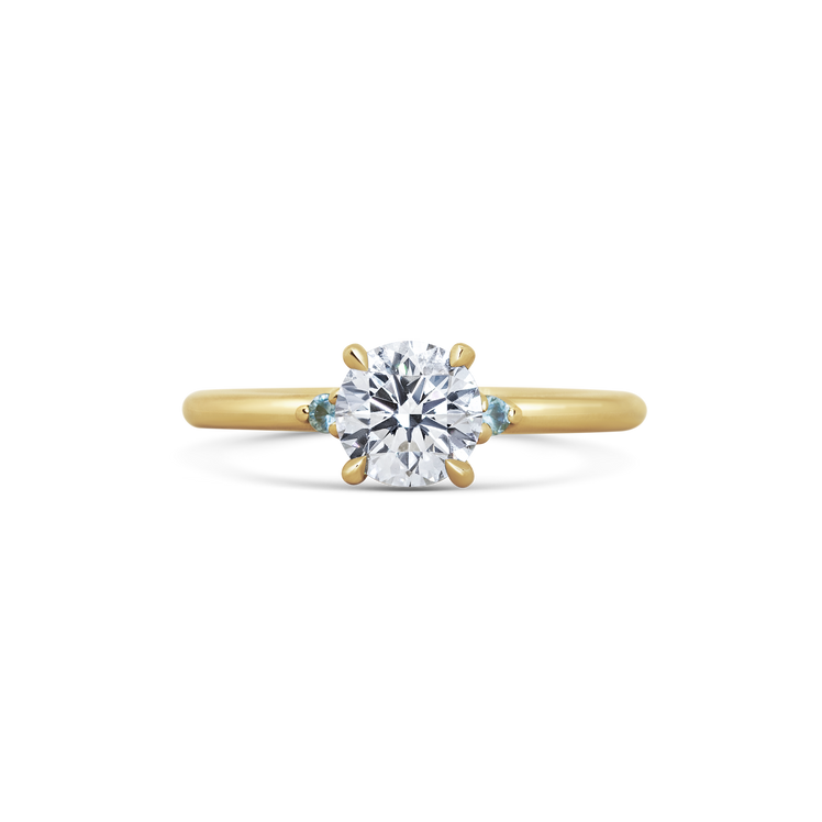 A classic ring design with subtle pop of colour. Featuring a brilliant cut white diamond centre stone with light blue Sapphire side stones.