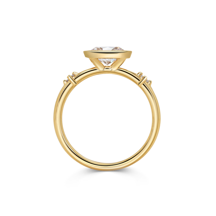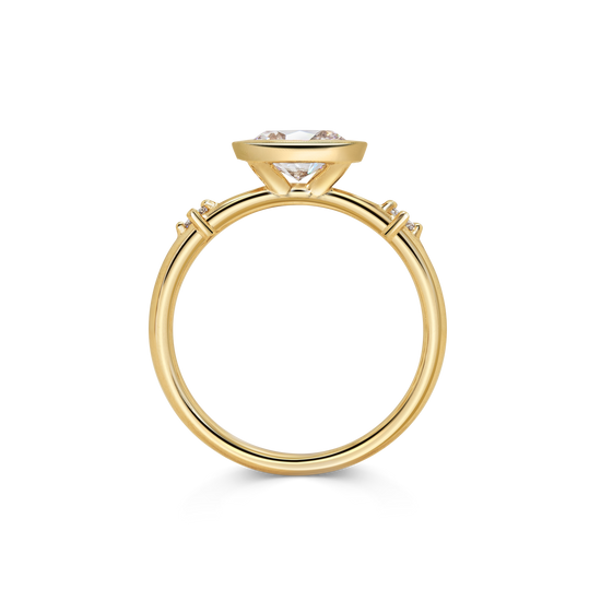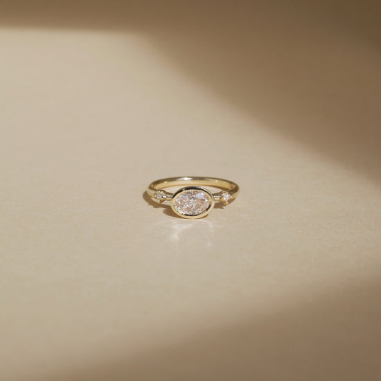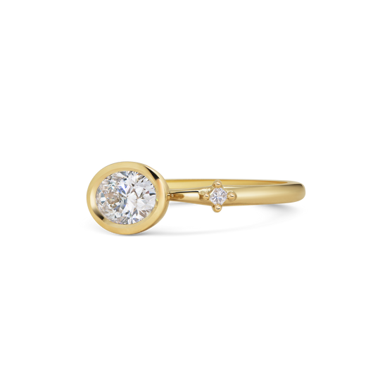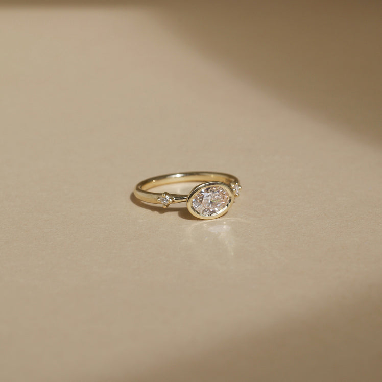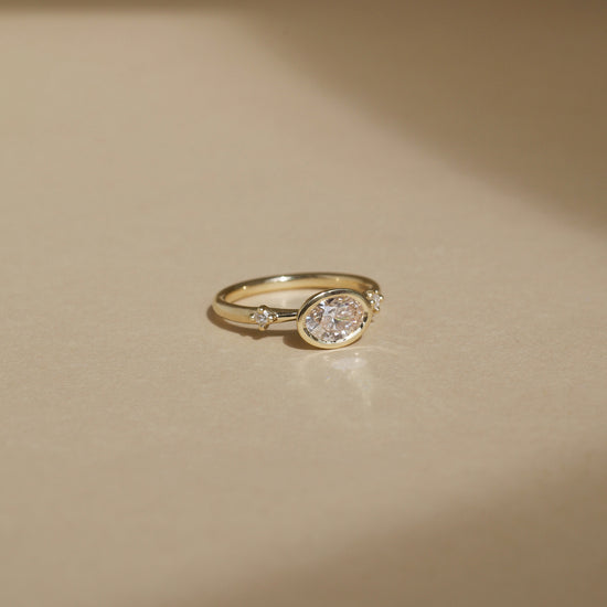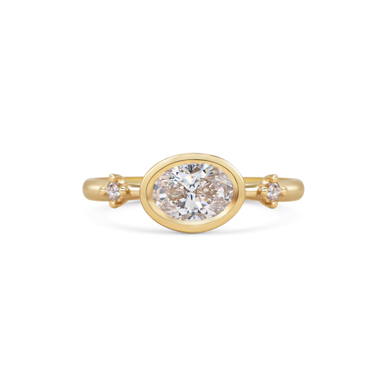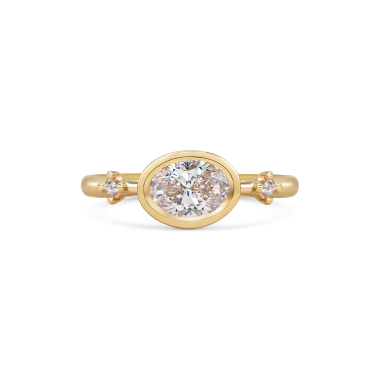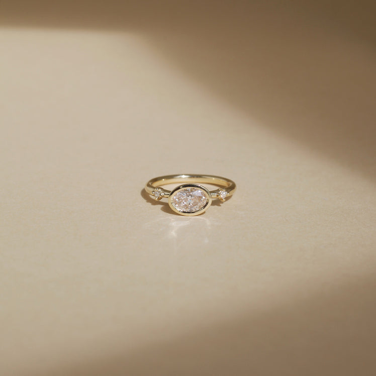 The Oval Astra Ring features an east-to-west oval diamond delicately bezel set, flanked on each side by two princess cut diamonds for an elegant, refined look.