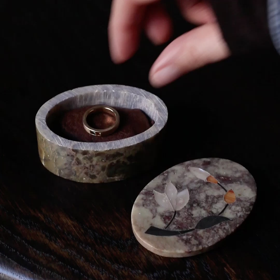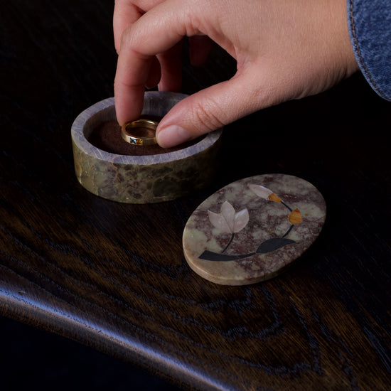 Vintage onyx keepsake box featuring delicate mother of pearl inlay to the lid, originally handmade in India. We have lined the interior with suedette to make this piece the perfect little container for your rings and earrings. Keep one by your dresser or sink as a reminder to remove your rings before washing. A beautiful way to keep your jewellery safe whilst elevating your home decor. In very good vintage condition
