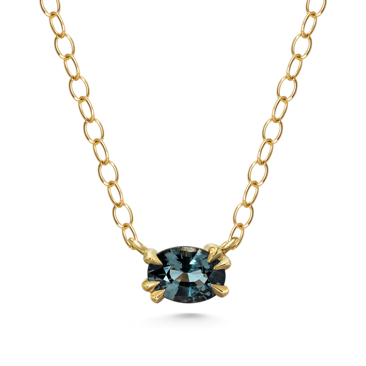 A timeless delicate sapphire necklace, signature asymmetric double claws hold this teal oval sapphire.