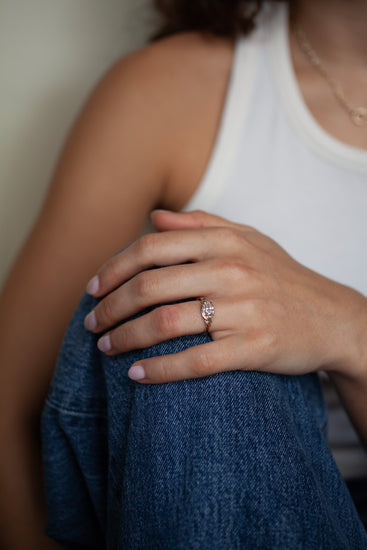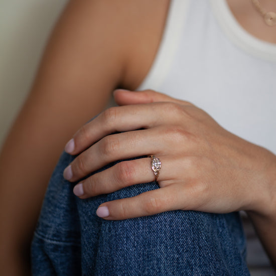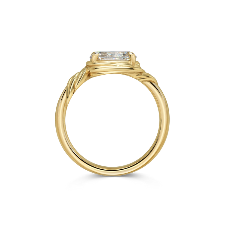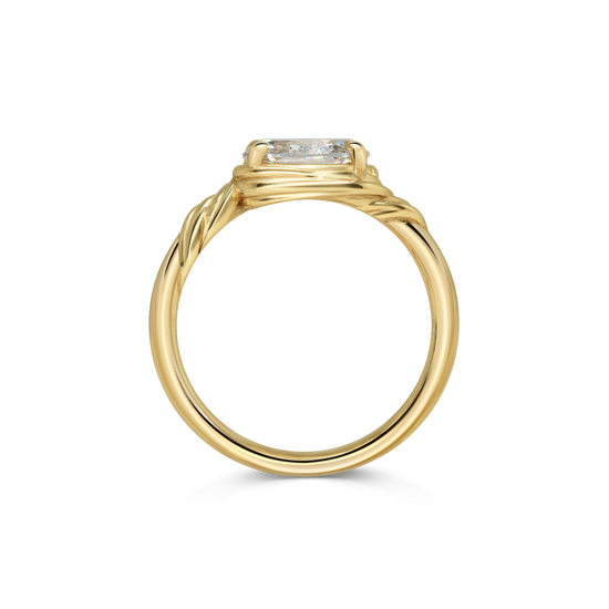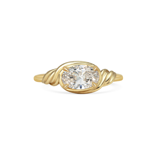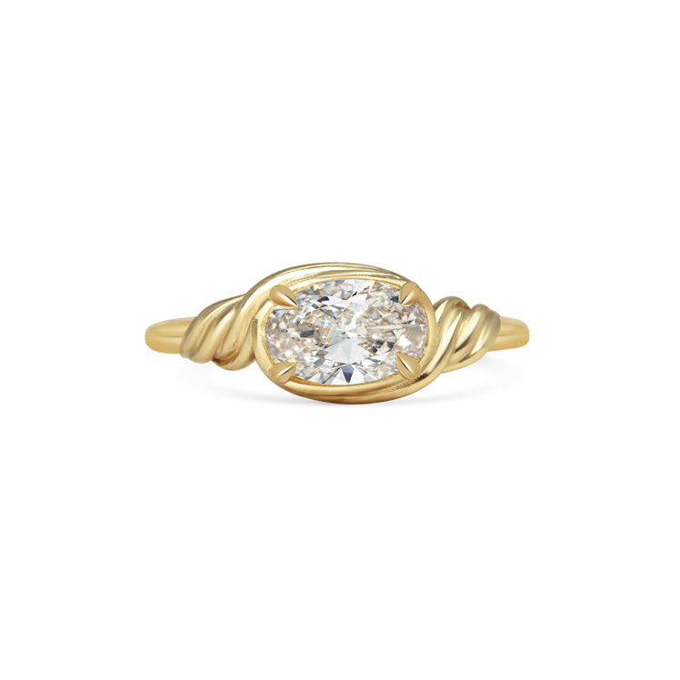 The Oval Torque Ring showcases an East-To-West set diamond held by delicate talon claws on a fluid twisted band.
