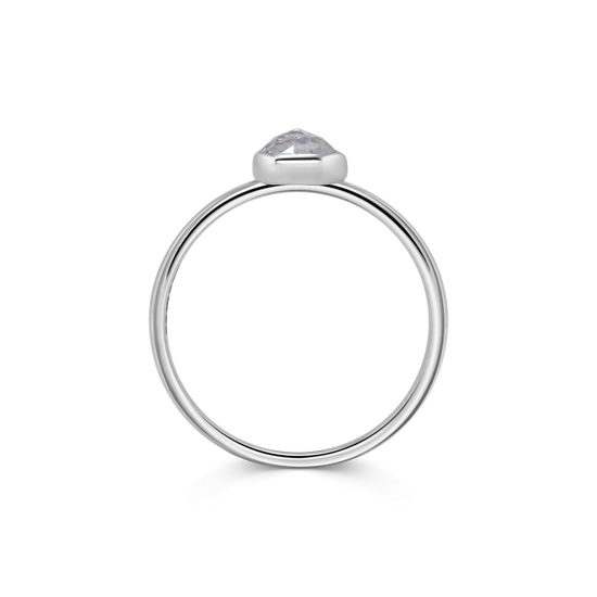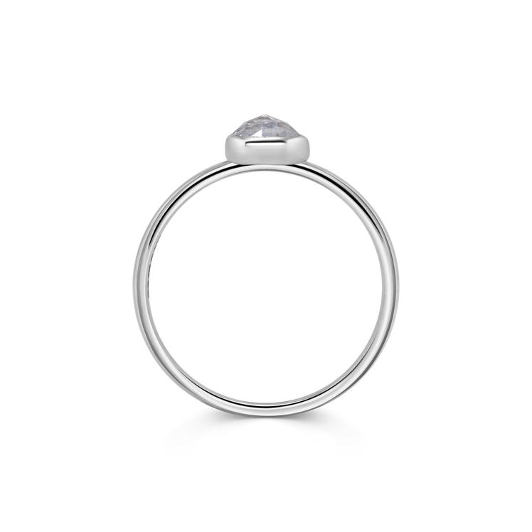 Ring 004 features a 0.5ct rose cut oval diamond and a 2.5mm round brilliant cut diamond. Held in a smooth bezel setting.