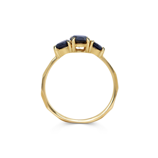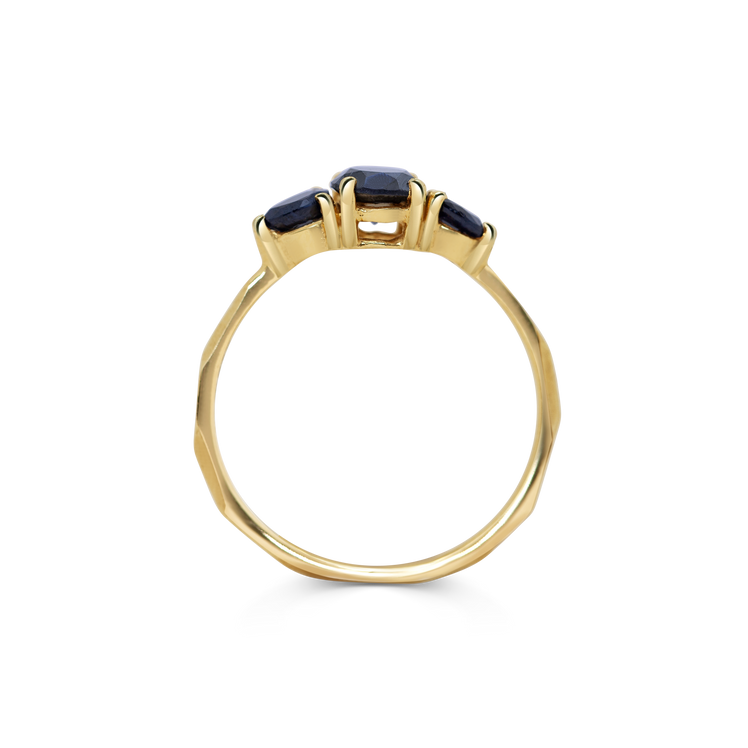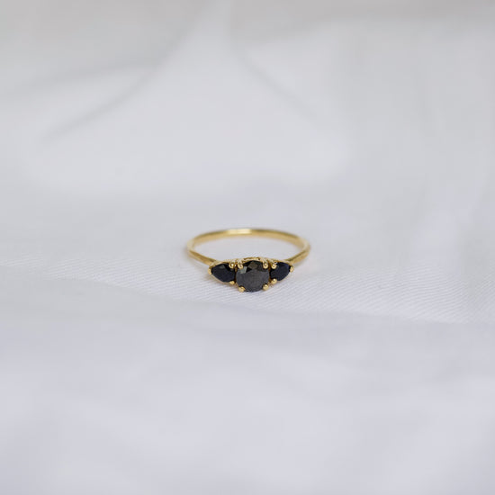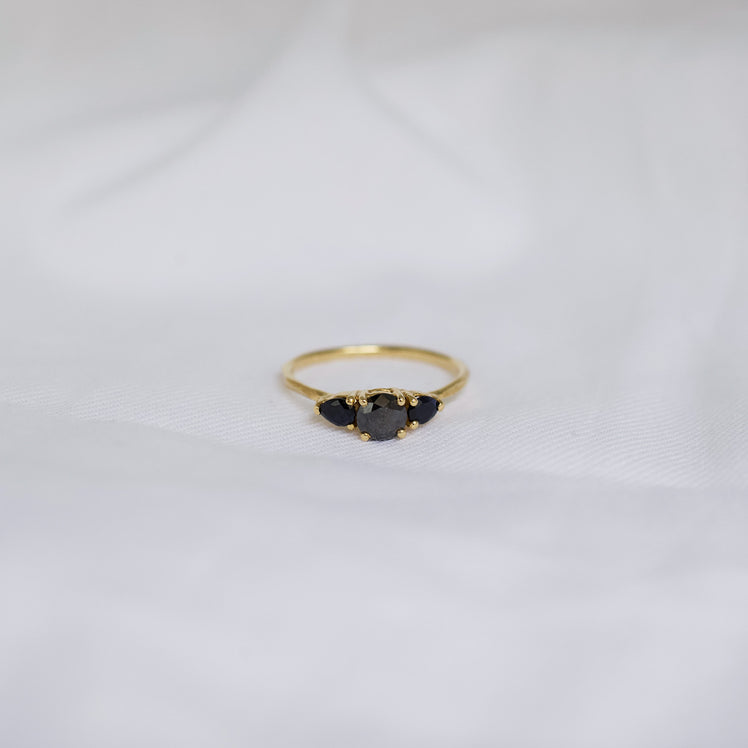 Ring 005 features a 0.55ct dark blue round sapphire centre stone, Flanked by two black diamond pears