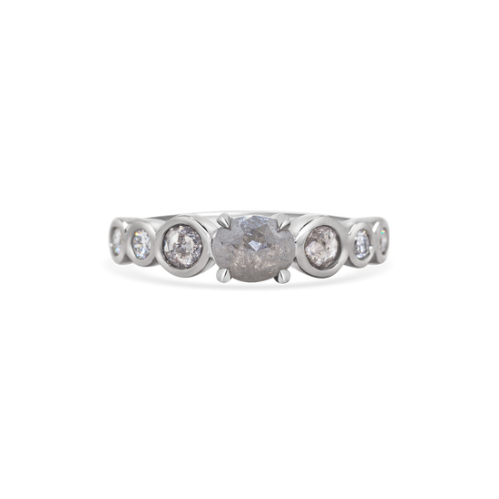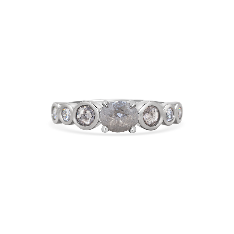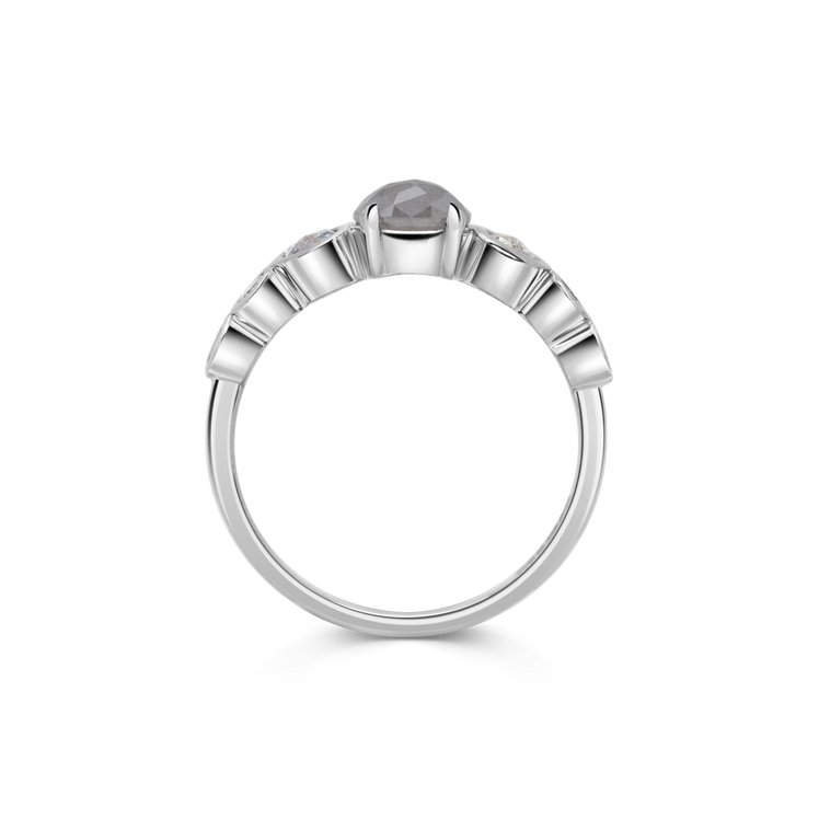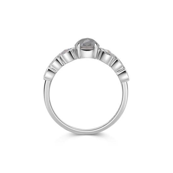 Ring 008 features a central oval cut grey diamond, flanked by two salt and pepper rose cut diamonds and two brilliant cut diamonds at either end.