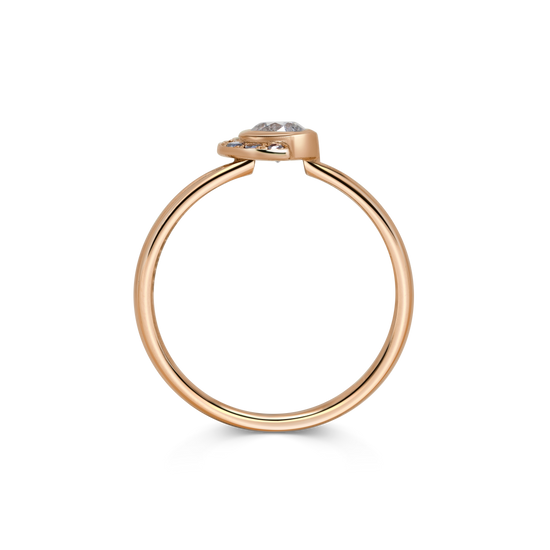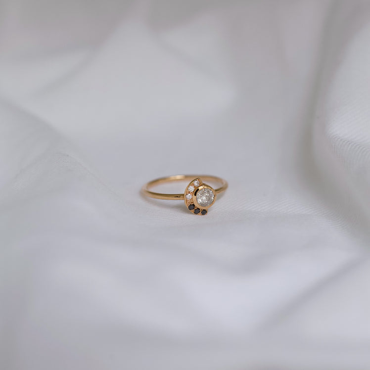 Ring 009 features a round salt and pepper rose cut diamond, bezel set with asymmetric black and white diamonds surrounding it.
