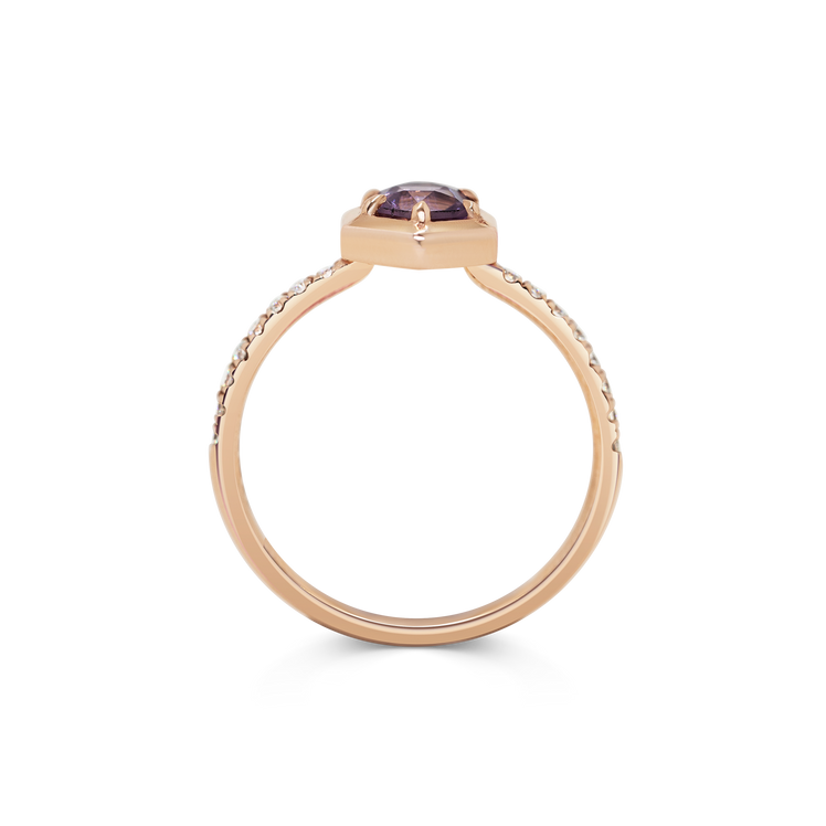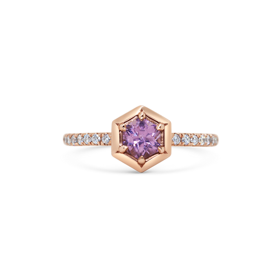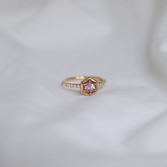 Ring 010 features a hexagon cut pink spinel, claw set in a hexagon setting. Pave diamonds along the band.