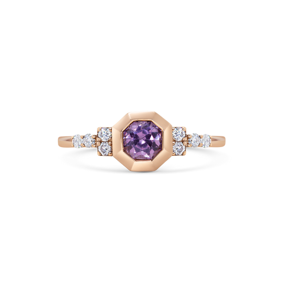 Ring 015 features a round pink spinel set in a hexagon bezel, flanked by smaller round brilliant cut diamonds.