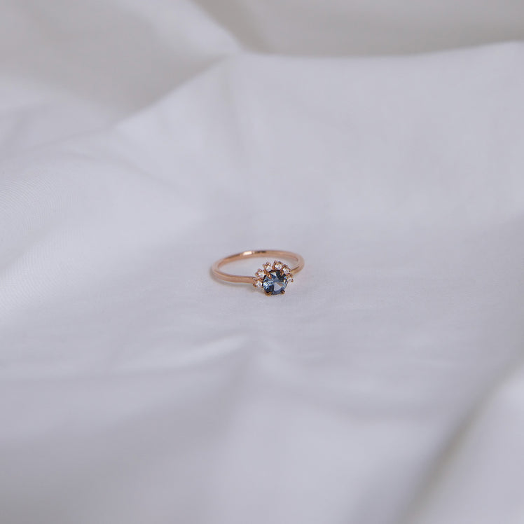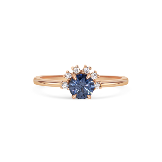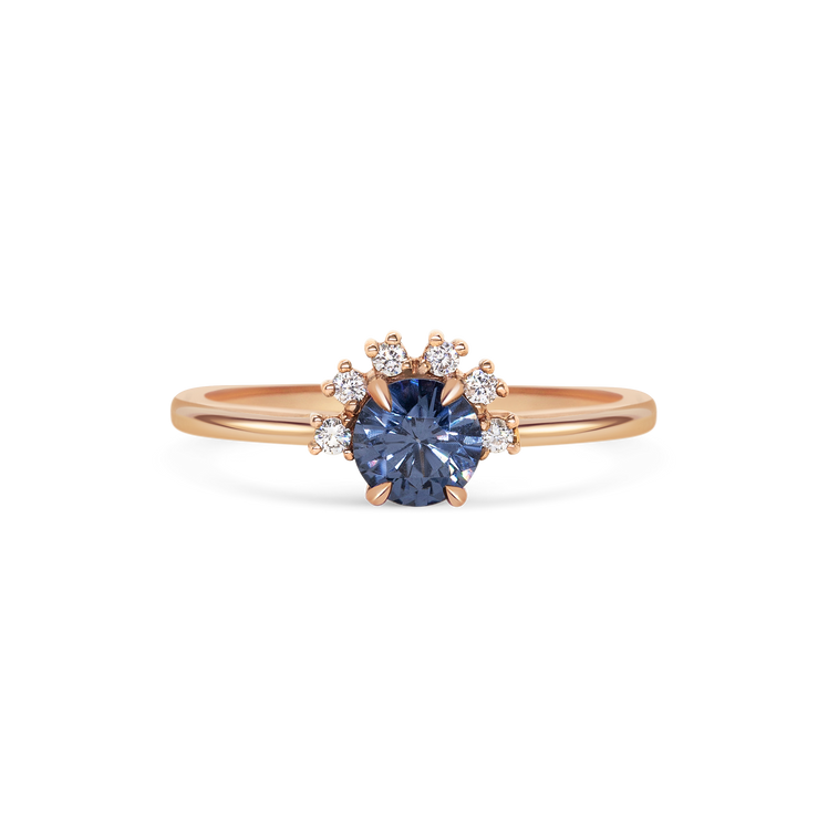 Ring 016 features a round blue spinel with a half halo of brilliant cut diamonds. All held in claws.