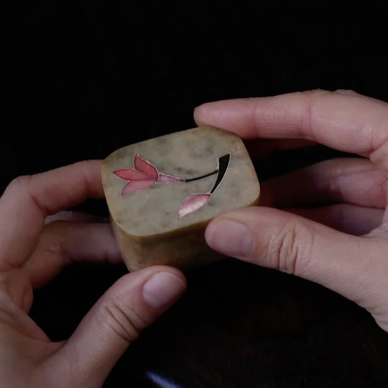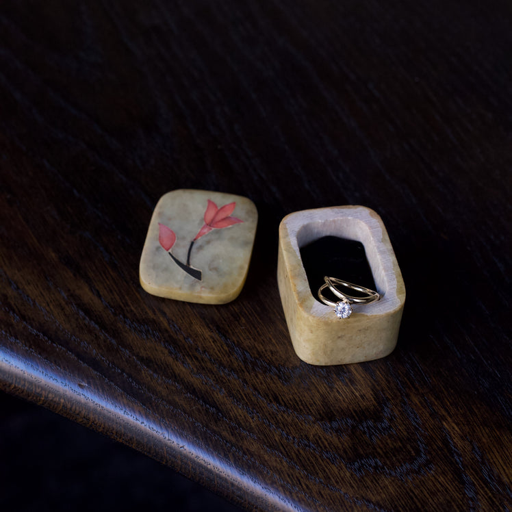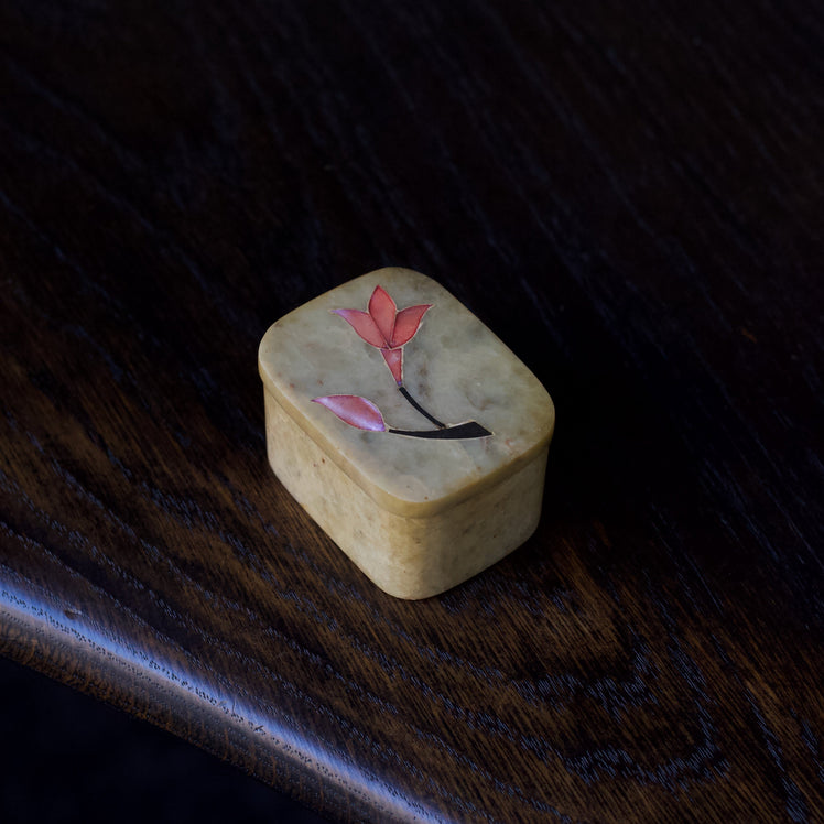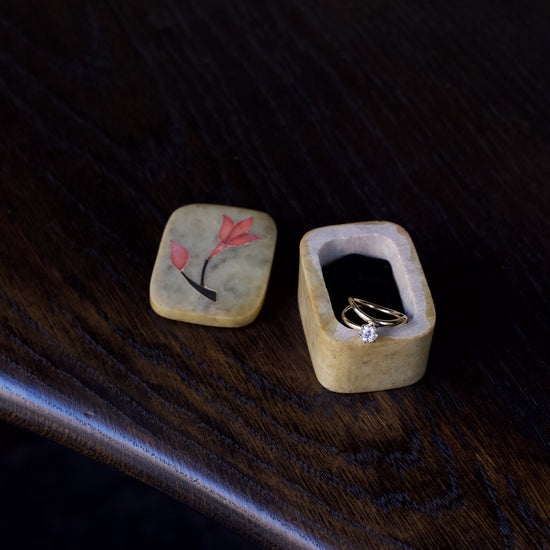 Vintage onyx keepsake box featuring delicate mother of pearl inlay to the lid, originally handmade in India. We have lined the interior with suedette to make this piece the perfect little container for your rings and earrings. Keep one by your dresser or sink as a reminder to remove your rings before washing. A beautiful way to keep your jewellery safe whilst elevating your home decor. In very good vintage condition
