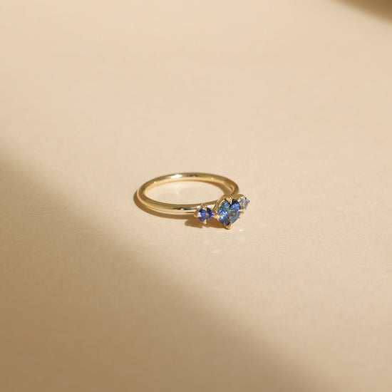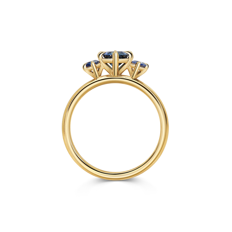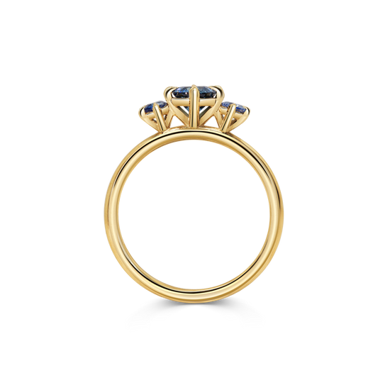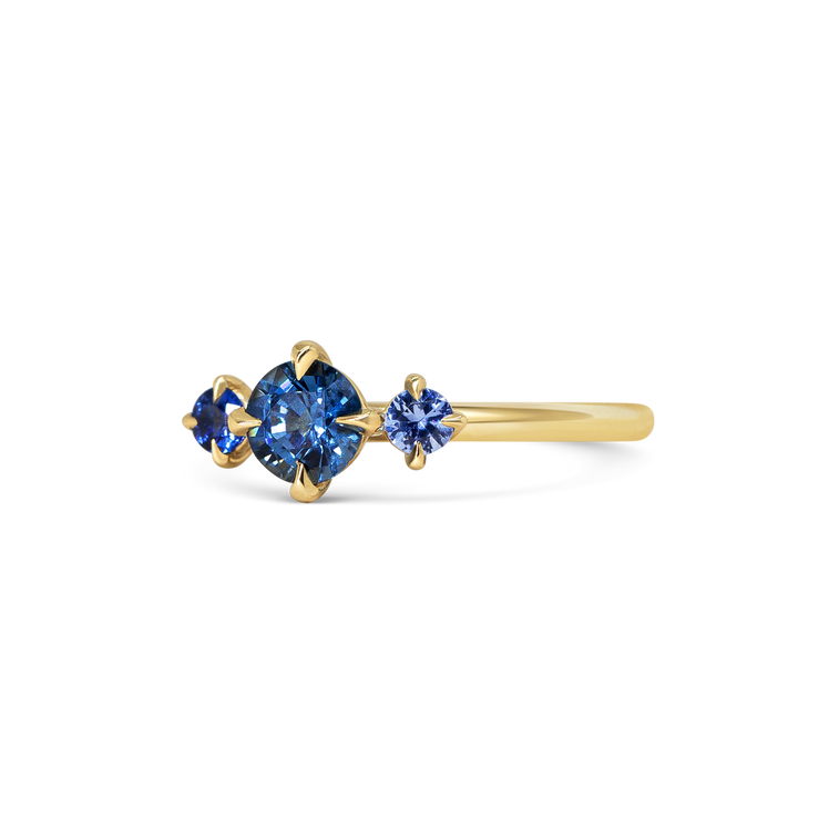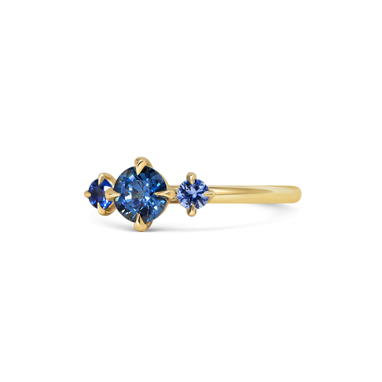 The classic trilogy gets a modern update in this unique setting style, featuring three hues of blue sapphire.
