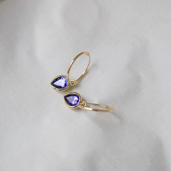 Our Bezel Drop hoops feature vivid, pear-cut Tanzanite gemstones set in polished gold bezel. Perfect for creating a radiant glow to your lobe.