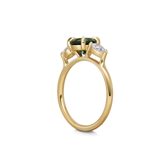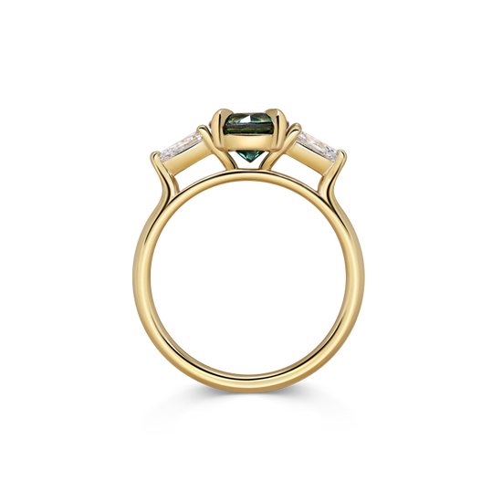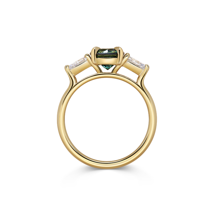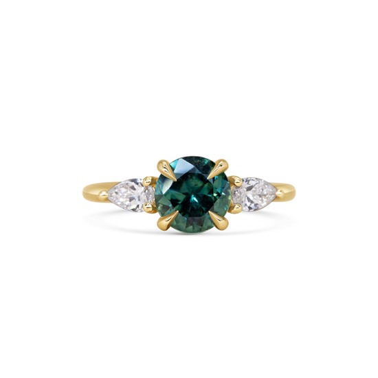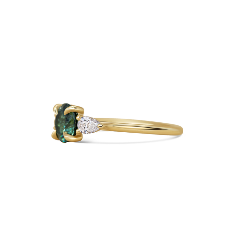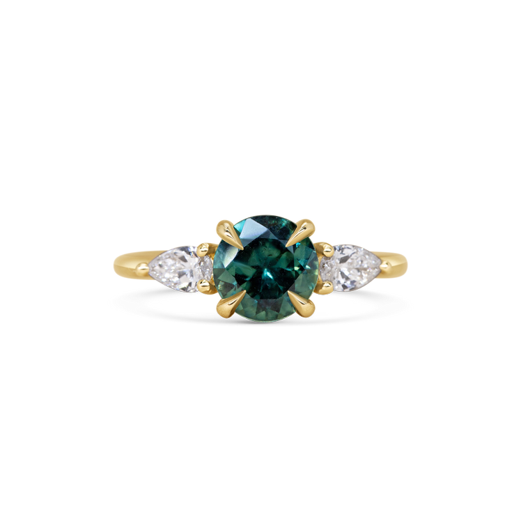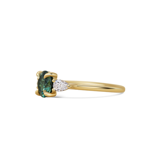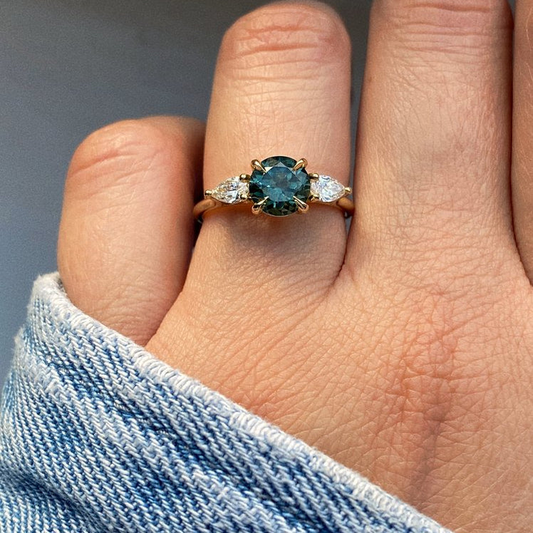 The classic trilogy ring gets a colourful update in this white diamond and teal sapphire combination