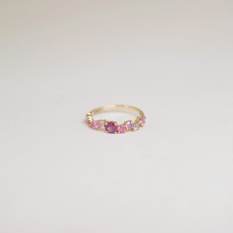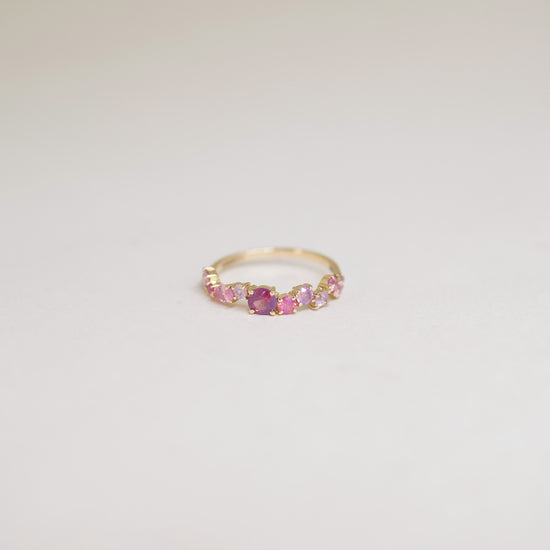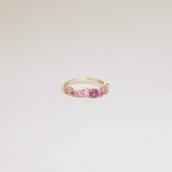 A geometric cluster of mixed shape and custom cut opalescent sapphires originating from Vietnam. This ring is one of a kind due to the unique nature of the rare individual stones used.