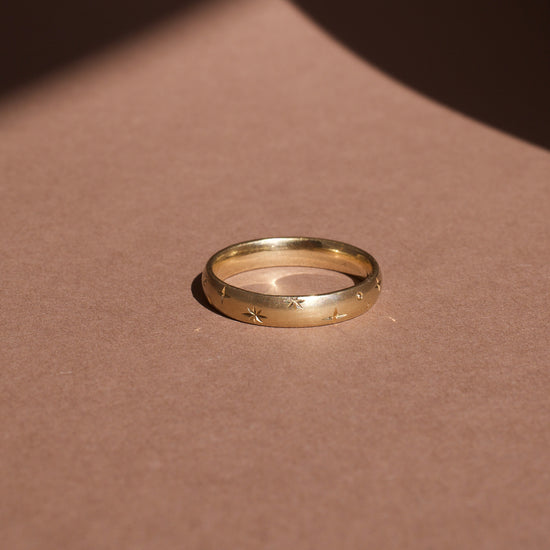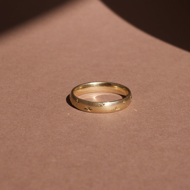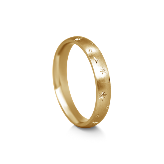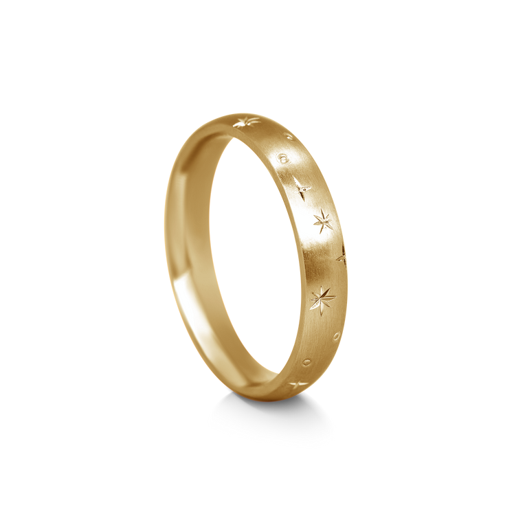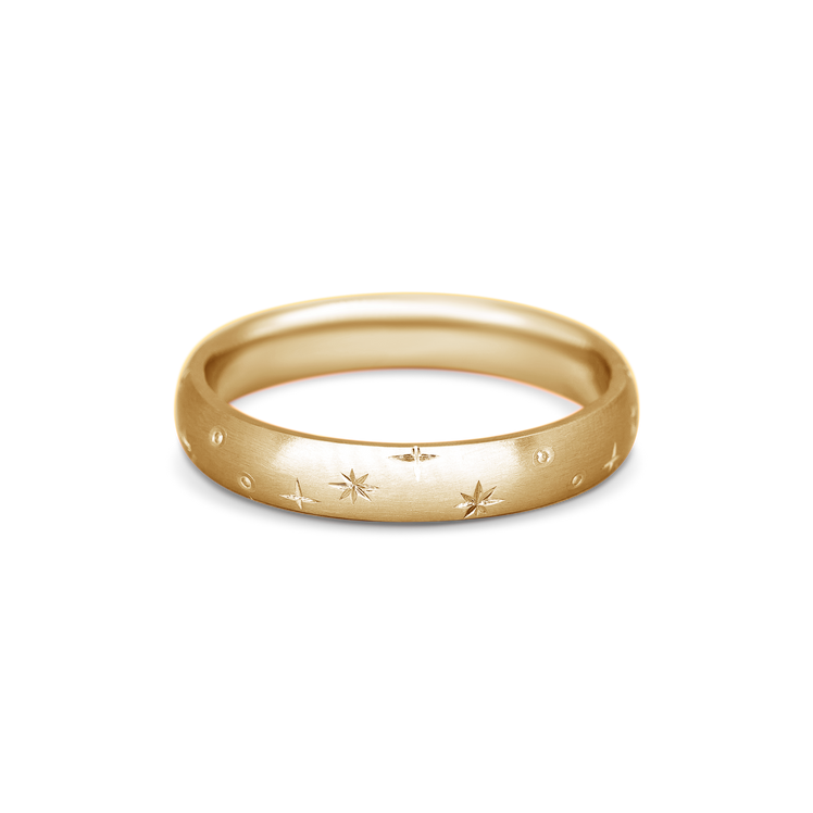 A contemporary unisex wedding band. The smooth texture and delicate star engraving give a really unique but subtle look.